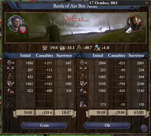 Rozbiłem ich armie w dwóch bitwach, a później spokojnie zajmowałem sobie teren chcąc uzyskać każdy holding (jak się potem okazało dupa ze mnie i zapomniałem o skrawku ziemi nieco na wschód, ale dokończyłem tam robotę spiskami i morderstwami. Po trzech i pół roku było już po wszystkim i pan muslim musiał ugiąć się pod siłą nordyckiego topora.