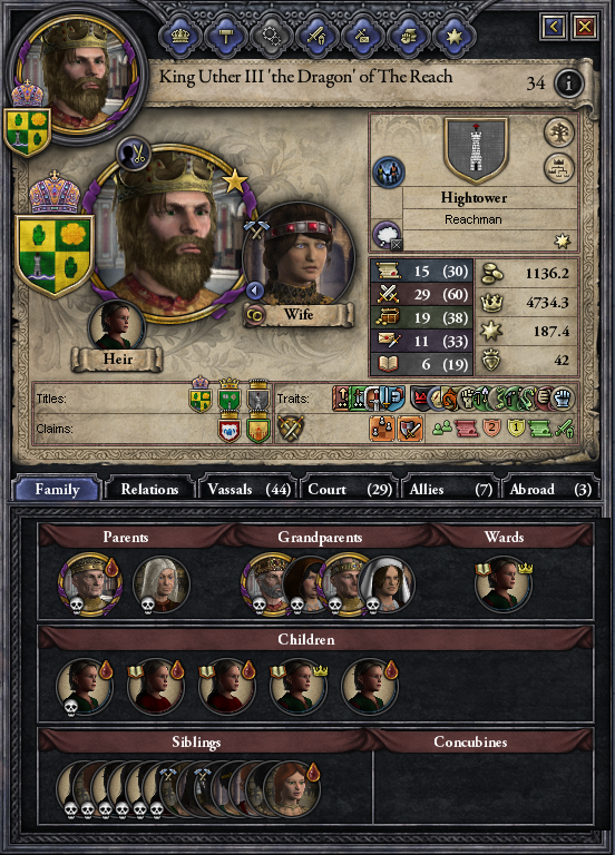 Wysoki Król Uther z Rodu Hightowerów, Trzeci Tego Imienia, Król Andalów, Rhoynarów i Pierwszych Ludzi, Lord Protektor Jedenastu Królestw, Dziedzic Strzaskanych Tronów, Smok. Największy władca w historii Westeros i jeden z największych zdobywców w dziejach... erm... Planetos (?), niewiele ustępujący legendarnemu Jaehaerysowi Sprawiedliwemu z dynastii Targaryenów, który półtora wieku wcześniej podbił większość Essos. W ciągu zaledwie dwudziestu lat swych rządów podporządkował Staremu Miastu królestwa Skały, Pazura, Trydentu, Żelaznych Wysp i Północy. Nie dokonał tego jednak tylko siłą oręża - po zajęciu Casterly Rock udał się na długą, samotną wyprawę. Powrócił jako smoczy jeździec, dosiadając potężnego żmija Arhugona, kryjącego się pośród ruin Smoczej Skały. Dołożył w ten sposób do domeny swego rodu nowe ziemie, po raz pierwszy jednocząc Zachód od Złamanego Ramienia aż po Mur. Jego małżonką jest Rhea z domu Velaryonów, dosiadająca smoka Al'thorydosa.