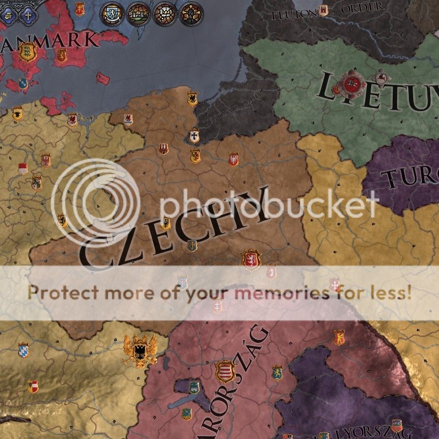 - Przejdźmy jeszcze na chwilę do Słowian i Bałtów. Królowa Pomorza wyszła za Króla Litwy który przy okazji jest następcą na tronie Polski. Pomorze kontroluje w zasadzie Brandenburgię oraz Pomorze przednie i tylne. Polska zajmuje te same tereny co na starcie gry plus pomorze gdańskie. Czechy kontrolują Czechy, Morawy oraz całe południowe Niemcy tj. Bawarię, Badenię i Wirtembergię (tylko okolice Monachium kontroluje królestwo Bawarii). Na Bałkanach mamy Jugosławię! a nie to tylko Słowenia (Slavonia) kontrolująca te same tereny. Serbia niedawno kontrolowała część Grecji z Tracją ale została niedawno pokonana przez Arabów.
