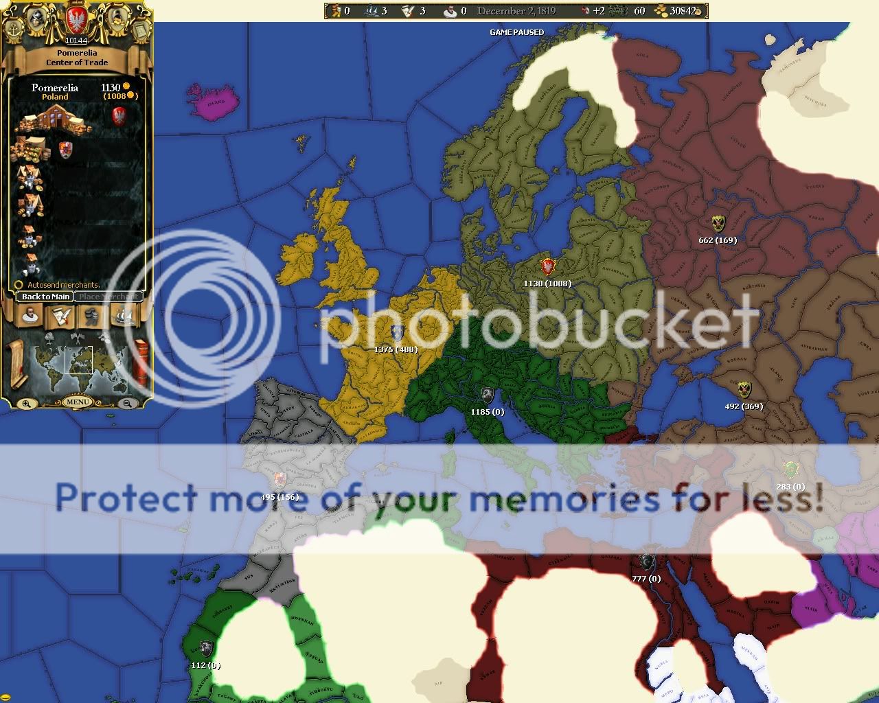 Dobijam do maxa w ostatnim techu (morski) i odtąd na potęgę powstają wszędzie gdzie się da manufaktury (nie ma co robić z kasą). ma miejsce ogólnoeuropejska wojna: Hiszpania-Francja-Wenecja-Dania-Szwecja-Turcja-Wołoszczyzna-Rosja vs Austria-Papiestwo-Polska-Prusy-Litwa-Anglia-Portugalia-Holandia. Wojna toczy się m. in. o przywrócenie monarchii w Polsce. Wygrywa drugi sojusz (w zasadzie dwa osobne sojusze) jednak zmiany w większości wypadków nie są duże. Turcja nic nie traci, Wołoszczyzna Chorwację na rzecz Austrii, Francja parę kolonii i niewielkie (jedne prov) we Francji na rzecz Anglii, Hiszpania Brabancję na rzecz Austrii oraz parę kolonii na rzecz Polski (głównie punkty handlowe, do tego raczej biedne provy, ale ładniej granica wygląda :p), Rosja nie traci nic jak i Szwecja, Wenecja wychodzi lekko portubowana bo oddaje ziemie Austrii. Najgorzej ma się Dania, która traci wszystkie ziemie w Rzeszy poza Holsztynem na rzecz Prus, tutaj własnie mają miejsce największe starcia gdzie armie są liczone w setkach tysięcy. O klęsce Danii przesądziło zdobycie Sztokholmu i wycofanie się Szwecji, która mocno wspierała Duńczyków i dokonała ofensywy na Pomorzu zdobywając polskiego cota. Potem wystarczyło tylko rozbić francuskie i hiszpańskie korpusy ekspedycyjne do czego dochodzi pod Oldenburgiem (największa bitwa w tej wojnie 250k polsko-prusko-litewskie vs 190k francusko-hiszpańsko-duńskie). Od początku wojny flota Polska (licząca już ok. 220 okrętów nie licząc flot kolonialnych) blokuje cieśniny duńskie doszczętnie niszcząc wrogie floty. Na szczęście jedyna liczniejsza flota - hiszpańska zajęta jest blokowaniem angielskich kolonii. Po tym konflikcie dochodzi do spotkania W Wiedniu przedstawicieli najważniejszych państw Europejskich i zostają podpisane układy na mocy, których państwa obejmują się wzajemnymi gwarancjami. Zapanowuje ład wiedeński, ale czy na długo?