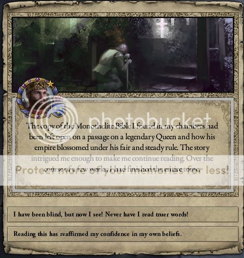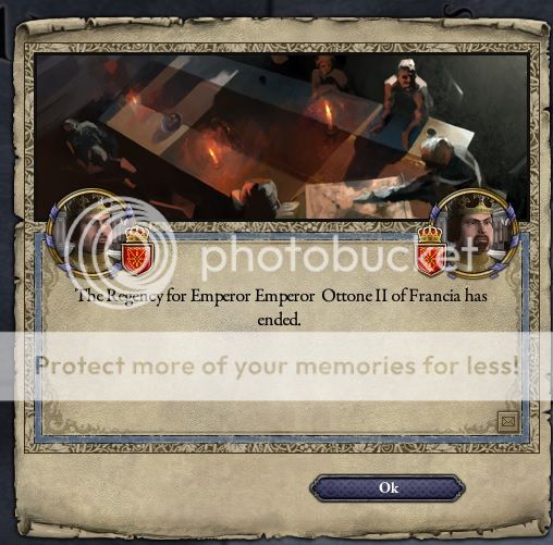 Kilka słów od autora: Dotarliśmy do końca. Przyznam, że fabuła, którą sobie założyłem, zmieniła się kilkukrotnie poprzez wydarzenia z gry, ale dotarliśmy do pewnej konkluzji. Frankowie nie zostali zgubieni! Jeśli chodzi o konwersję, to wątpię bym się jej podejmował, chociaż przez ostatnie lata gry chciałem doprowadzić do konfliktu między Iberią, a Paryżem. (co mi się udało tylko fabularnie, bowiem wasale iberyjscy mimo upokorzeń nie dołączali do frakcji niepodległościowej, a Janowi nie mogłem nadać tytułu cesarza Hiszpanii, gdyż Kalif ciągle toczył konflikty i tego tytułu nie mogłem uzurpować :l)