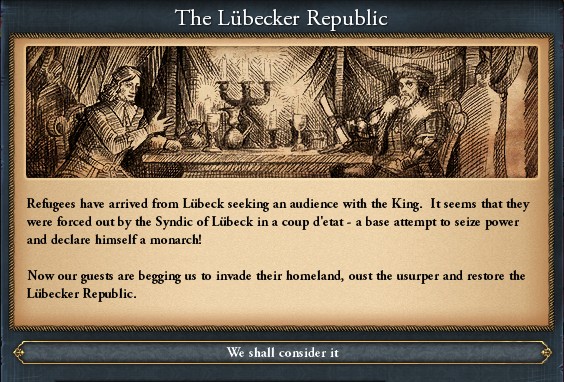 Nie był to jednak koniec nieszczęść Rzeczy Pospolitej. Anno Domini 1430 obrany nowym konsulem został możny kupiec i patrycjusz Emil ze Strzelec. Słaba była jednak jego władza nad pomorskimi stanami, tak jak i słaba była Rzecz Pospolita. I oto Duńczyk zdradziecki cieśniny swe dla szczecińskich okrętów zamknąwszy i na kantory szczecińskie w Roskilde, Bergen i Kopenhadze zdradliwie napadłszy, na Bornholmie i w pobliżu Lubeki wylądowawszy, tamtejsze miasta obległ. I gdy dostała się w duńskie ręce dumna Lubeka, pochwyceni zostali radni i ławnicy i na Długim Targu, ku uciesze żołdactwa obwieszeni. Ci zaś patrycjusze, kupcy i rzemieślnicy, którzy zdołali wymknąć się wrażemu żółdactwu, ku Brandenburgii, Saksonii i Polsce poczęli zbiegać.