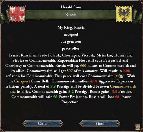 Cało wyszła Rzeczpospolita z owej niemieckiej awantury, być musi, iże Pan Bóg w Niebiesiech przy nas był, nie zaś przy heretykach. I choć wielu naszych w Saksonii dalekiej legło, a i ja sam ranionym zostałem, zbyt słabi byli już xiążęta by kampaniję nową w Pomorzu, czy Wielkiej Polsce przedsięwziąć. Potwierdzić był tedy przymuszon Sejm Rzeszy i sam cesarz takoż, prawa Jego Królewskiej Mości do swarzyńskiego księstwa, takoż Lubeki samej, które to z piastowego pochodzenia przynależały się tak królowi, tak i jego potomkom, oby byli liczni. A i siłę odszkodowań i reparacyi zobowiązono się wypłacić Rzeczpospolitej, takoż i my łupy wielkie w pludrackich krajach pobralim.