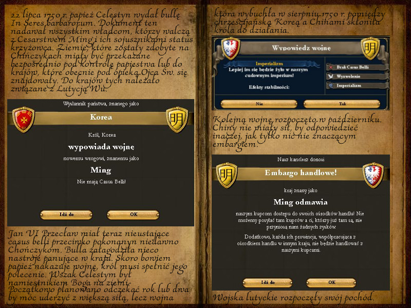 @Szowek - owszem, zdobyłem kilka prowincji, są one bogate. Ale wojna też kosztuje ;) Te armie, dzięki którym odniosłem zwycięstwo były ogromne. Poza tym te prowincje za niedługo, zgodnie z układem z papieżem, trafią do Wu.