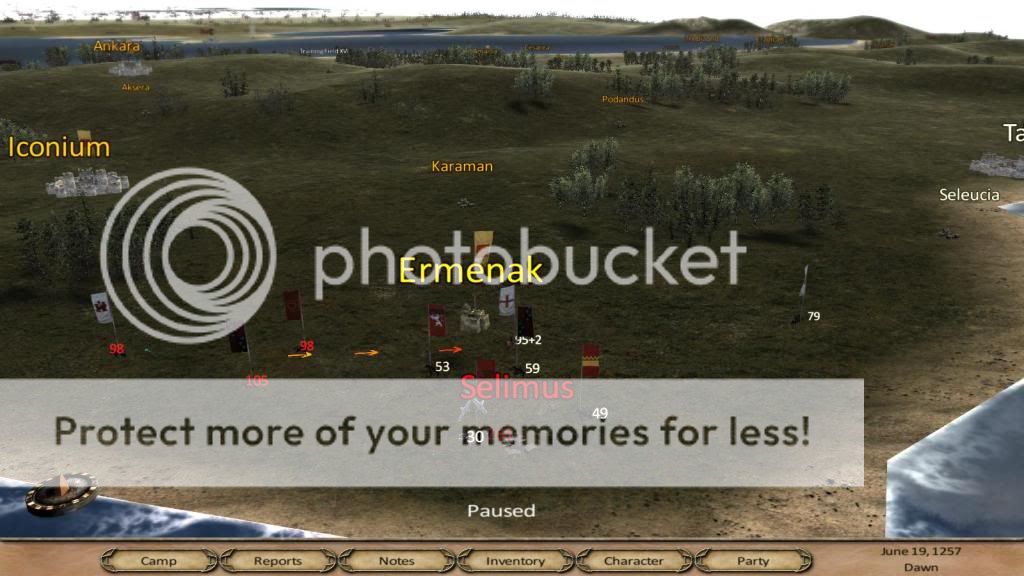 Operacja Tanganika rozpoczęła się! Na kilka dni przed ofensywą, wioski zostały wykupione z zapasów jedzenia, okoliczne miasta z broni i pancerzy. Miała to być ogromna parada, wywyższająca nasze armie. Cel jednak, był trudnym orzechem do zjedzenia. Spod Myry ruszyliśmy wieczorem, aby w nocy przebyć gęste lasy będące na granicy z krzyżowcami. Tuż po świcie, nawet bez zwiadowców, dostrzegliśmy ofensywę wroga. Niespodzianka była o tyle duża, że w nocy, jeden z oddziałów wroga, przeszedł przez naszą forpocztę niezauważony i znalazł się na moich tyłach. Nie mieliśmy innego wyjścia, jak wydać im bitwę. Bitwa nie odbiegała od innych. Podzieliłem armie na dwie części. Pierwsza, kawaleryjska, pod moim dowództwem miała atakować, natomiast druga, piechotna, pod komendą Milvena, miała się okopać i bronić. Tuż po rozpoczęciu bitwy ustawiłem wszystkie oddziały kawalerii w klin, największy jak dotąd, frontem do ustawiającego się wroga. Po około minucie rozpocząłem szturm. Impet kawalerii szybko przetrzebił wojska wroga, które szybko się rozpierzchły. Od tego momentu moja kawaleria, jak i oddziały piesze wyłapywały pojedyncze jednostki. Droga na Cypr była wolna!
