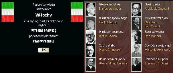 3 stycznia we Włoszech odbywają się wybory parlamentarne połączone z referendum w sprawie zmiany ustroju. Przytłaczająca większość (81%) społeczeństwa tego kraju opowiada się za zniesieniem monarchii, co też daje asumpt do opuszczenia kraju przez Wiktora Emanuela III i udanie się na emigrację do Szwajcarii. Republika Włoska (Repubblica Italiana) na której czele stoi rząd Alcide de Gasperi’ego rozpisuje powszechne wybory prezydenckie, w których wygrywa Enrico de Nicola. Tak oto na oczach mieszkańców Europy, kolejna monarchia jednoznacznie odchodzi w przeszłość. Nowy rząd włoski zaczyna od wydarzenia, które w dużej mierze zaczyna niepokoić sojusz aliancki i kraje tzw. Deklaracji Bałkańskiej, a dokładniej mówiąc już 13 stycznia dochodzi do podpisania sojuszu militarnego z Republiką Austrii na mocy porozumienia de Gasperi-Figl zw. później układem alpejskim. Na wieść o podpisaniu sojuszu między Austrią a Włochami, wojska Bundeswehry i Czechosłowacji rozpoczęły dyslokację z północnych terenów na południowe. W innych państwie tego regionu również rosną wpływy włoskie, czego przykładem niech będzie wybór przedstawiciela ludności tego języka w Szwajcarii, Enrico Celio na stanowisko prezydenta. Stany Zjednoczone od dawna wyrażają się niechętnie o włoskiej polityce zagranicznej, a sojusz z Austrią może być pewnym zabezpieczeniem przed aliantem na wypadek wybuchu wojny z Libią. Sekretarz generalny OPD, Anthony Eden podjął decyzję o spotkaniu z de Gasperim w Rzymie w 1. połowie lutego br.