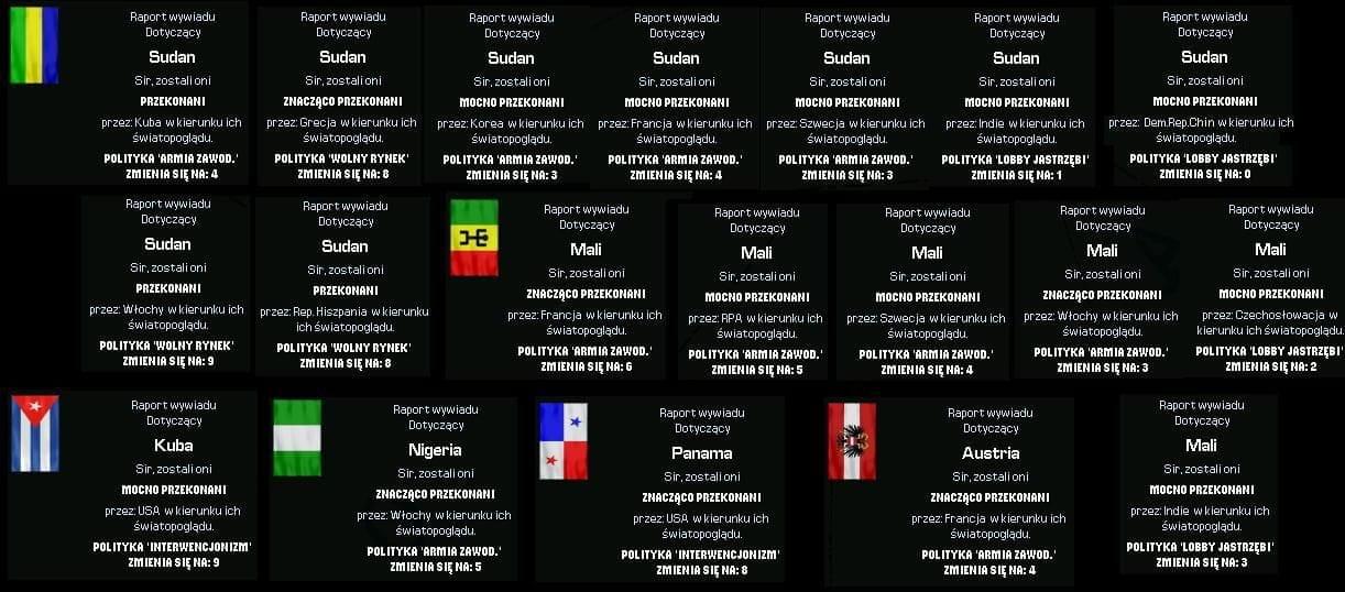 Oprócz walki wywiadów różnych państw na terytorium Sudanu nie ustają też w wysiłkach te kraje, które starają się uzyskać swoje wpływy na ziemiach Federacji Mali. Włochy, Portugalia czyli państwa z przeciwstawnych bloków militarnych oraz neutralny Ekwador to przykłady nacisku dyplomatycznego na ten kraj. Rząd włoski usiłuje też uzyskać koncesje handlowe na terytorium Nigerii. Wyraźnie też zwraca uwagę wzajemne wzmacnianie się krajów w obrębie Paktu Alpejskiego (Austria-Francja). Amerykańskie misje wojskowe do Panama City i Quito są wyrazem objęcia w przyszłości nad Ekwadorem i Panamą protektoratu.