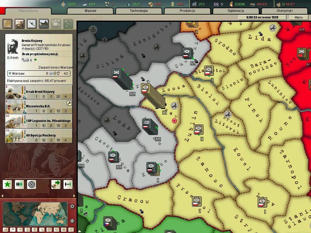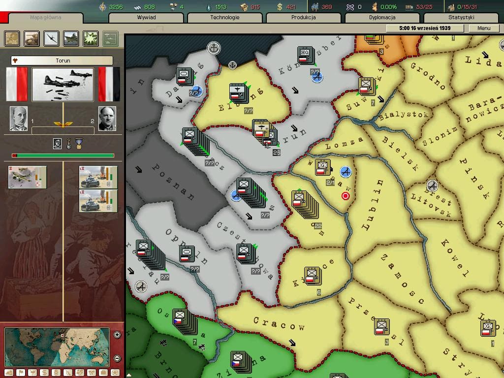 Od pierwszego dnia można było zaobserwować, niebywałą siłę ofensywy niemieckiej na froncie polskim. Plan Rydza- Śmigłego o neutralizacji Prus Wschodnich zupełnie się nie powiódł. Wskutek natarcia niemieckiego na Bydgoszcz z dwóch kierunków: z Pomorza Zach i Prus Wsch. – atak polski na Elbląg musiał zostać wycofany i zarządzano odwrót na Płn. Mazowsze po drugiej stronie Wisły. Dzielnie atakowały jednostki Armii „Północ” i Armii „Mazowsze” w bitwie o Konigsberg. Zrezygnowały z ataku dopiero wtedy, gdy wyczerpały swoje siły w dużej większości. Na odcinku południowym Armia „Kraków” musiała wycofać się w stronę Kielc wskutek silnego ataku jednostek niemieckich. Słowem blitzkrieg w pełni. Niemieckie oddziały to w większości doświadczone oddziały z czasów wojny z Włochami i tu moim zdaniem jest czynnik decydujący. Do tego dochodzi sprzęt pancerny oraz sporo jednostek lądowych wz. 1939. Po otrząśnięciu się z etapu wojny na pograniczu żołnierz polski powoli wychodzi z odrętwienia. Szok po utracie Bydgoszczy i Częstochowy (3.IX.), Poznania (5.IX.), Gdańska i Łodzi (9.IX.) zostaje zastąpiony nowym śmiałym planem Naczelnego Wodza dotyczącego ataku na Prusy Wsch. Tym razem atak się udaje. Armia Mazowsze pod dowództwem gen. Sikorskiego zdobywa Elbląg (8.IX.). Tego samego dnia rozpoczyna się wprawdzie odwrót, bo Niemcy atakują z Królewca, ale sztab Naczelnego Wodza przewidział to i połączone Armie Mazowsze, Kujawy i Północ atakują jednostki niemieckie na Mazurach, są o krok od wygrania bitwy. Taka sama sytuacja panuje jeśli chodzi o kierunek południowy. Armia Śląsk i Kraków przy współudziale Grup Operacyjnych próbują odbić Częstochowę. Trzeba wspomnieć mężnie o stratach. Armia Poznań gen. Schally’ego zostaje zupełnie rozbita a dowódca wzięty do niewoli. Utrata 3 dywizji może nie spowoduje załamania całego frontu, ale wydatnie utrudnia jego obronę przy szczupłości sił polskich oraz ich niedostatecznej modernizacji. Jeśli zaś chodzi o wojnę morską to pierwsze bitwy były w zdecydowanym stopniu wygrane przez polskie siły nawodne. Dochodzi jednak do dwóch bitew morskich z całą potęgą Kriegsmarine; jedną u wybrzeży Szwecji, drugą w Zatoce Gdańskiej. Polskie niszczyciele „Błyskawica”, „Wicher” posłane na dno przez „Admirala Scheera”, druga bitwa w Zatoce Gdańskiej kończy się hekatombą, nie udał się odwrót flocie polskiej i swój udział w wojnie zakończyły wszystkie polskie okręty nawodne (krążowniki lekkie – „Admirał Dickmann” i „Bałtyk” zatopione przez „Schleswiga-Holsteina” i „Admirala Grafa von Spee”). Samozatopienia wskutek ogromnych uszkodzeń dokonują niszczyciel „Burza” i krążownik lekki „Komendant Piłsudski”. Wskutek takiego obrotu sprawy 6 nowoczesnych okrętów podwodnych pod dowództwem wiceadm. Świrskiego skierowano do portów brytyjskich, aby kontynuowały walkę, 10 września są już na wysokości Helgolandu i z całą pewnością w pełnym składzie dotrą do angielskich portów. Na zakończenie trzeba dodać niezwykłe poświęcenie polskich lotników, którzy w znaczącym stopniu z każdym nalotem osłabiają siły niemieckie w Konigsbergu.