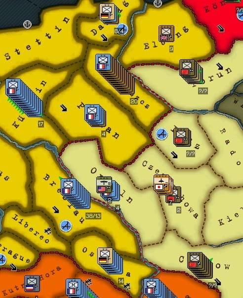 Zastój spowodowany mroźną zimą na froncie europejskim III wojny światowej nie dotyczy na szczęście działań zbrojnych na odcinku polskim. Tutaj, w wyniku eliminacji wrogich dywizji piechoty szybko pojawia się duża dysproporcja sił, skutkującą zmianą linii frontu na korzyść aliantów. Nowe posiłki francuskie, które pojawiają się na drugim brzegu Odry, pod Kostrzyniem, rozwijają natarcie w kierunku Śląska Opolskiego. Doskonałe warunki do szybkiego przesunięcia linii frontu panują też w środkowej i północnej części Polski. Sprzymierzeni wykorzystują słabość przeciwnika i wyprowadzają ataki na Łódź oraz Płock i Modlin. Zdobycie twierdzy modlińskiej przy równoczesnym opanowaniu okręgu łódzkiego oraz płd. Mazowsza umożliwi wyprowadzenie natarcia na Warszawę. Sowieci okazują się najsilniejsi pod Krakowem, gdzie trzymają aż 21 dywizji różnych typów. Jeśli chodzi o front bałkański to dość dziwna mobilizacja panuje na ziemi węgierskiej, a konkretnie pod Debreczynem, gdzie Sowieci zgromadzili aż czterdzieści trzy dywizje.