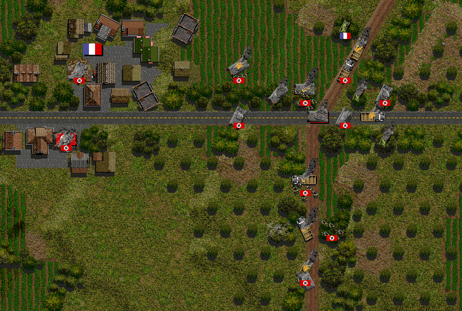Na południowym zachodzie dobiłem moździerz i zniszczyłem dwie ciężarówki. Przeciwnik w swojej turze ostrzelał mi piechotę i zajął ciężarówką flagę, która chwilę później została zniszczona. Flagę odzyskałem... wjeżdżając tam swoją ciężarówką a potem ją cofając. Ha!